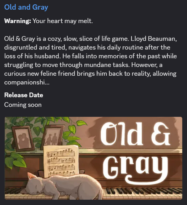 Parsely shared the Steam page for my their game! It’s a peek into the life of an elderly man who just lost his husband, and how he gets on in life in the aftermath of his loss. If it sounds neat, please add it to your wishlist!